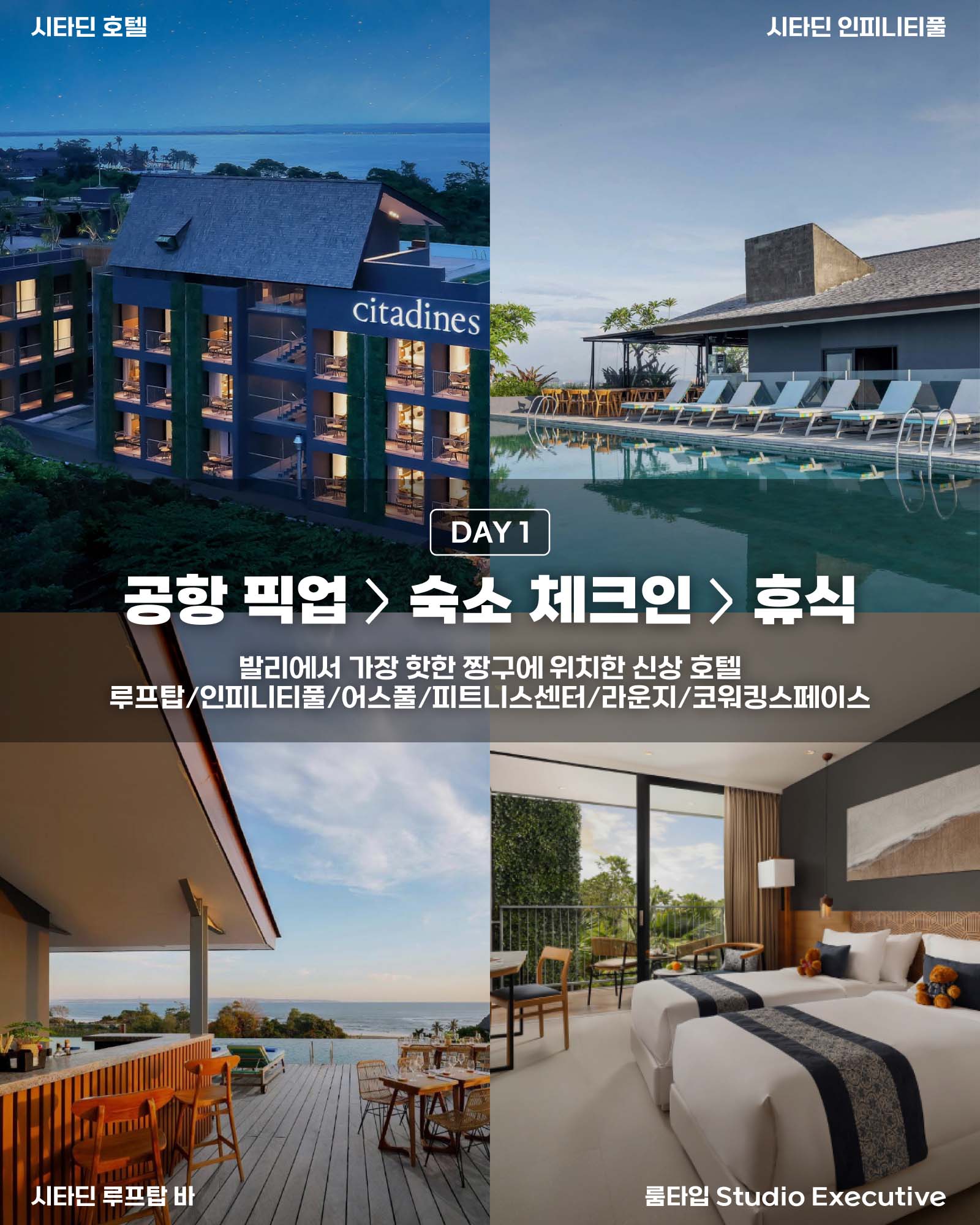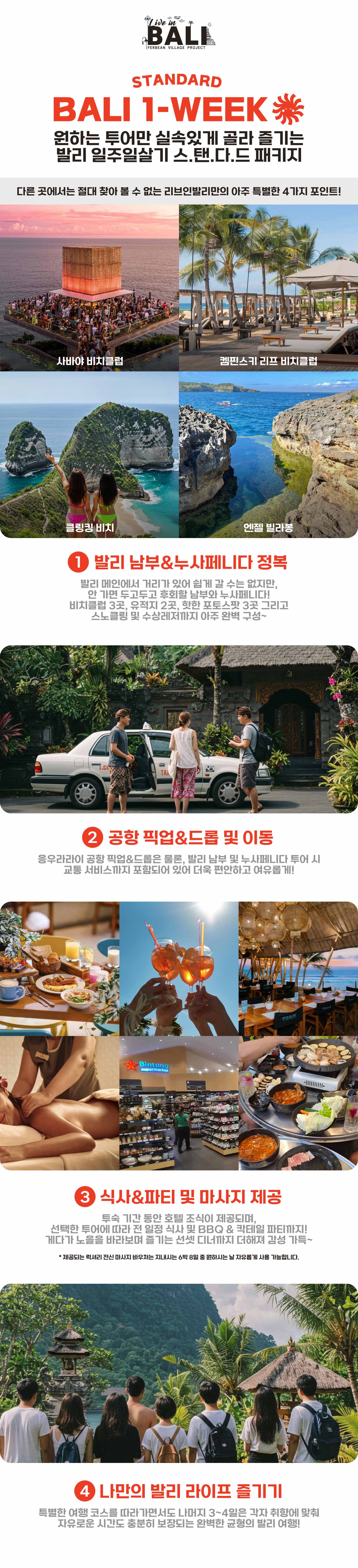 숙소, 공항 이동 서비스, 마사지 바우처가 기본 제공되며, 발리 남부 및 누사페니다 옵션 중 원하는 일정을 선택해 맞춤형으로 즐길수 있는 실속형 발리 일주일살기!