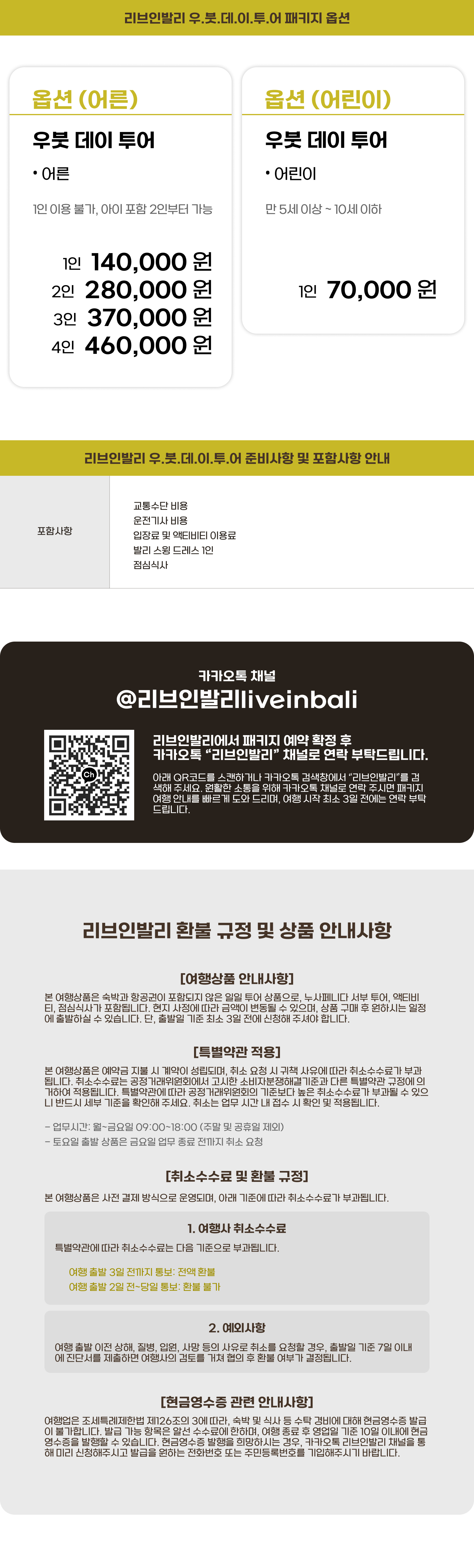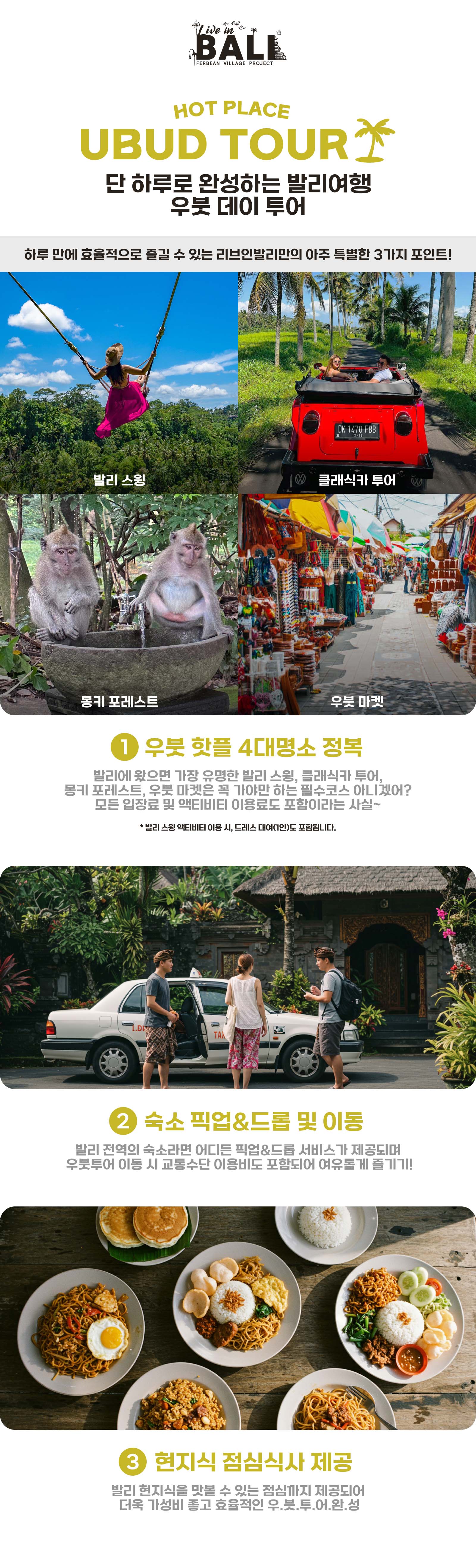 하루 만에 우붓 알차게 뿌시고 싶은 사람? 숙소 픽업부터 인생샷 보장하는 발리 스윙, 감성 충전 클래식카 투어, 귀염뽀짝 몽키 포레스트, 현지감성 가득한 우붓 마켓까지! 게다가 로컬 맛집에서 즐기는 점심식사까지 포함이라는 사실~ 핵심만 쏙쏙 담은 데이 투어로 우붓을 제대로 경험하고 싶다면 리브인발리와 함께하세요!